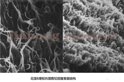 三、剪切屈服機(jī)理。尼龍6增韌共混物在拉伸或沖擊斷裂的瞬間,斷面產(chǎn)生高溫,達(dá)到基體的玻璃化溫度Tg以上,基體斷裂型變時(shí)產(chǎn)生塑性流動(dòng),基體剪切屈服耗散了大量的沖擊能,韌性大幅提高。