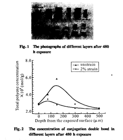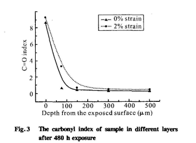 (1)近表層:在該層中,以氧化反應為主。該區域在光老化過程中會生成大量羰基,從紅外分析可知,受應力時為0μm~150μm,無應力時氧化層厚度為0 μm-75 μm;且受應力時,試樣的總羰基指數高于無應力狀態。說明在近表層,應力促進PVC的氧化反應發生。